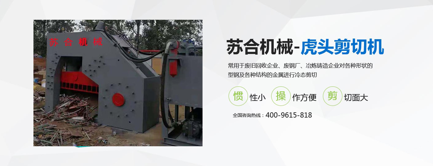 虎頭剪具有體積小、重量輕、慣性小、噪音低、動作平穩、操作方便、靈活、剪切斷面大、剪刀口調整方便等優點,操作使用安全。常用于廢舊回收企業、廢鋼廠、冶煉鑄造企業對各種形狀的型鋼及各種結構的金屬進行冷態剪切。剪切機的用途就是用來剪切定尺、切頭、切尾、切邊、切試樣及切除軋件的局部缺陷等。 滑縣蘇合機械制造有限公司性能穩定,操作簡單。歡迎來電咨詢 <了解更多>